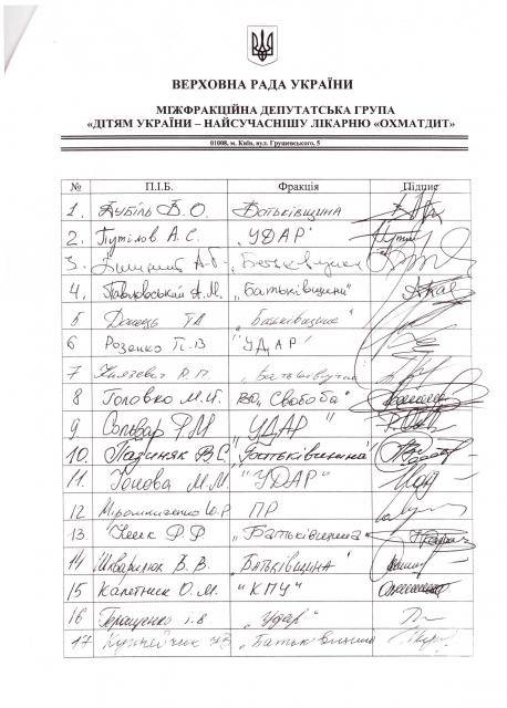 - Міжфракційне об’єднання «Дітям України – найсучаснішу лікарню «Охматдит» діятиме на принципах верховенства права, законності, рівноправ’я, колегіальності, вільного обговорення і вирішення питань, - прокоментував Валерій Дубіль. - До нас можуть долучитися інші народні депутати, ми налаштовані на співпрацю з керівництвом та комітетами Верховної Ради, депутатськими фракціями та групами, Адміністрацією Президента та Кабінетом Міністрів, іншими органами державної влади та громадськими організаціями і об’єднаннями.