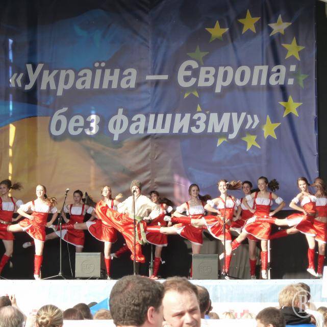 Так, зовсім, забули… Окрім глибокої стурбованості фашизмом в Україні (щоправда, усі спікери обходили конкретику), з трибуни закликали йти у… Європу. Так, саме туди. Виглядало це приблизно так, ніби людей зігнали в точку збору і оголосили замість ГУЛАГу нову сонцесяйну перспективу. Хоча тхнуло від цього маразму не менше, ніж від перспективи ГУЛАГу.