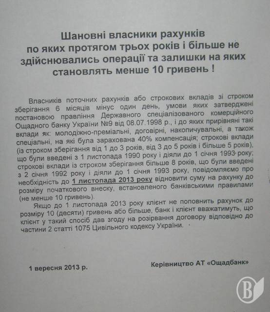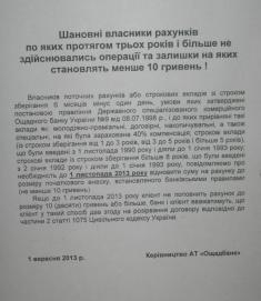Крім того, у мільйонів громадян України 1 листопада 2013 року будуть фактично конфісковані на користь "АТ "Ощадбанк" їх кошти, як "комісійна винагорода за закриття нерухомих вкладів фізичних осіб розміром до 10 грн." Про це керівництво АТ «Ощадбанк» також вирішило не оповіщати громадян України ні через друковані ЗМІ, ні електронні.