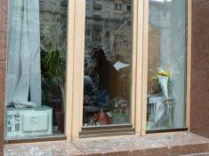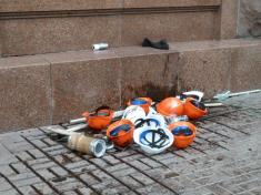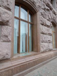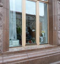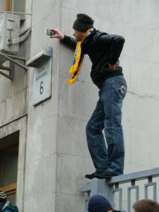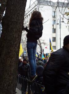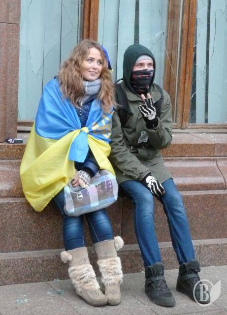 А вот Киевскую горгосадминистрацию и совет охраняли хуже - молодые люди в строительных касках с закрытыми лицами ее штурмовали. Правда немножко разлили на мостовую зажигательную смесь.