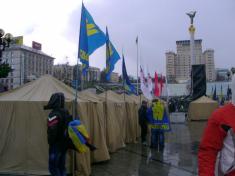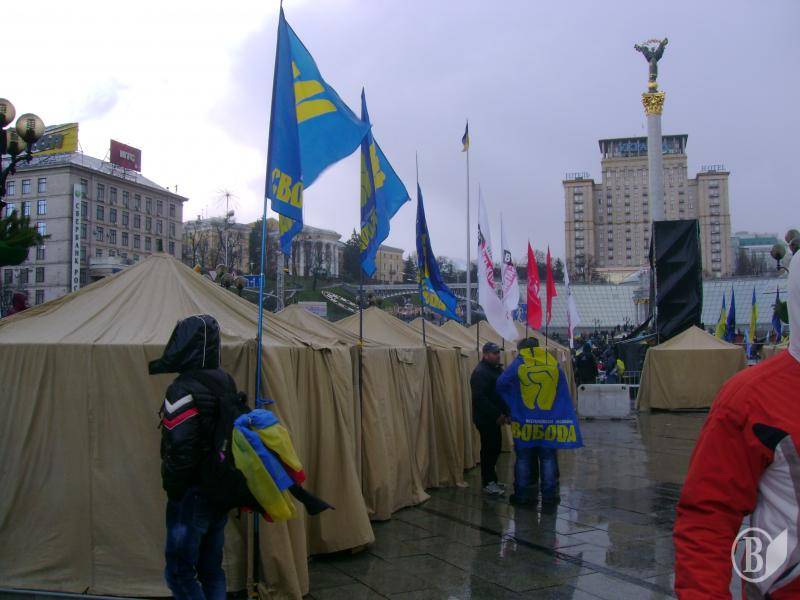 Палаточный городок, который поставили на Площади Независимость участники Вече, простоял всю ночь на понедельник. В занятом оппозицией Доме профсоюзов на Площади заработал Всеукраинский штаб национального сопротивления, который руководит акциями оппозиции в столице и координирует ее действию по всей Украине. Также оппозиция заняла дом Киеврады. Оппозиционеры разрабатывают планы защиты Площади и центра столицы, который практически контролируется оппозицией. На Площади объявлена на понедельник 2 декабря общеукраинская забастовка с требованием переизбрания власти. Звувчит объявление, что людей на ночдег принимают Михайловский монастырь, а также Александровский римо-католический костел рядом с Майданом.