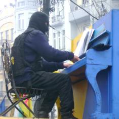 Над барикадами лунають «Революційний етюд» Шопена, інші твори європейських композиторів. Далі за піаніно сідали всі, хто міг показати свою гру. Один із виступів був незвичайним. Музиканта представили як «піаніста-екстреміста». Саме «екстремістами» називають учасників революції її вороги. А цей молодий хлопець, який так і не знімав під час гри маски, чудово грав класичну музику (на фото).