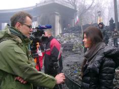 ДО ФОТО: «Червону руту» Руслана співає разом з барикадою. Інтерв`ю польському телебаченню.