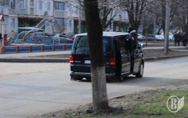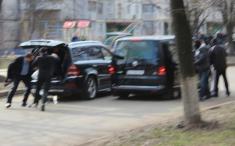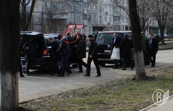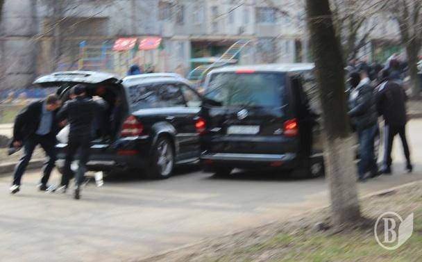 На фото видно, як Добкін у супроводі молодиків в масках та з помповими рушницями сідає у чорний бус і їде в невідомому напрямку. Фото вдалося зробити користувачу Facebook Євгену Демченко.