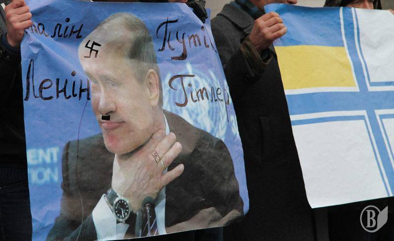 Путін був представлений у військовій есесівській формі. На інших портретах - йому були примальовані характерні вуса-щіточка, як у диктора.