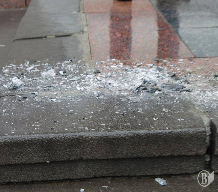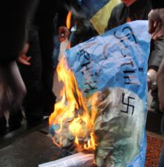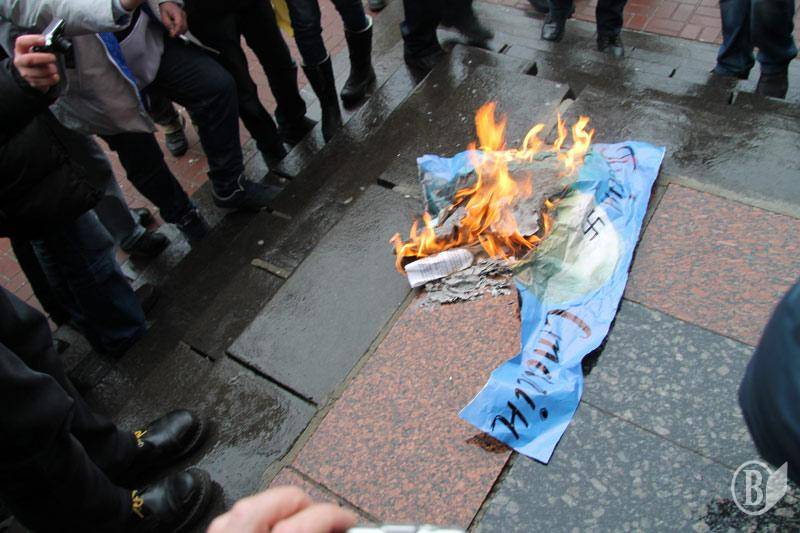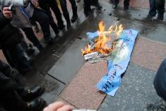 Після закінчення мітингу чернігівці почали палити портрет Путіна на сходах театру.