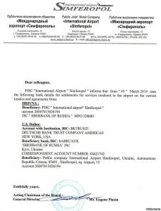 Крім того, за даними документа, з 5 березня 2014 року в аеропорті "Сімферополь" змінилися банківські реквізити, і всі фінансові розрахунки стали проводити через "Сбербанк Росії".