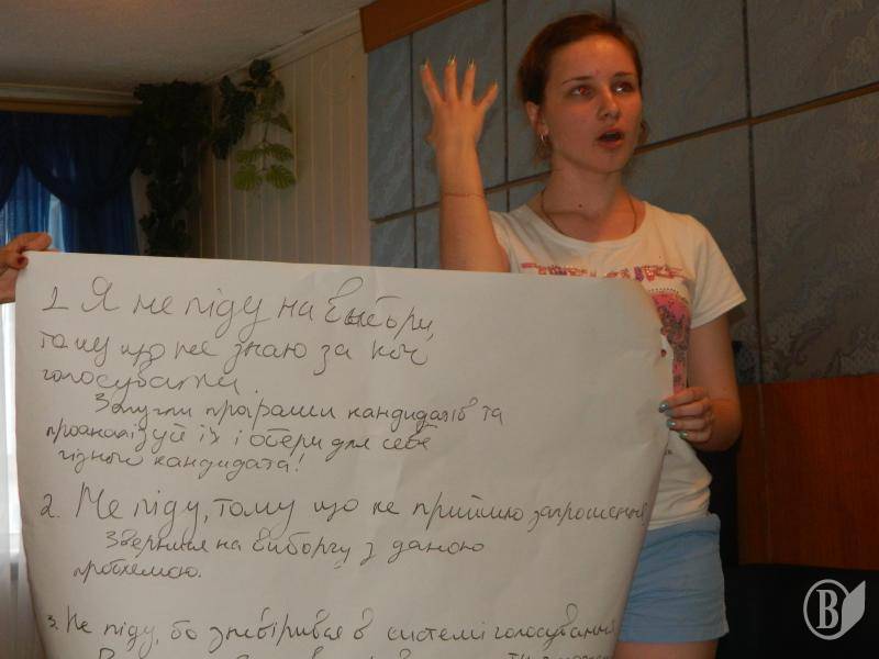 Этот вопрос выясняли с помощью работы в командах, определения самых распространенных отговорок от голосования и общего поиска способов убедить их принять участие в выборах. Говорили и о влиянии агитации на выбор украинцев и определяли желаемые черты идеального кандидата.