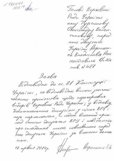 Народний депутат України Владислав Атрошенко написав на їм’я спікера Ради Олександр Турчинова заяву про складання депутатського мандата.