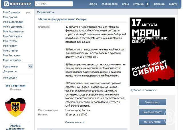 Однако реакция властей не заставила себя долго ждать: Генпрокуратура России добилась блокировки групп в соцсетях, а Роскомнадзор - удаления интервью с новосибирским художником Артемом Лоскутовым на Slon. ru, в котором тот рассказывал о планах провести марш за федерализацию Сибири. Во "ВКонтакте" и Facebook накануне появились страницы с призывами прийти в 17.00 17 августа на марш за федерализацию Сибири.
