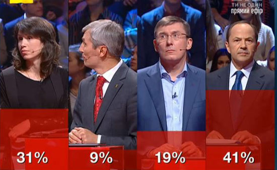 Під час дебатів провладні кандидати встигли обмінятися докорами один до оддного. Так, Тетяна Чорновіл дорікнула Юрію Луценку в тому, що президентська політична сила підтримує на мажоритарних округах відомих корупціонерів. А експерт програми, економічний журналіст Олександр Дубинський висловив претензії до «свободівця» Руслана Кошулинського через нечесність його колеги і партійного боса - Олега Тягнибока, який виявився замішаним в махінаціях з нерухомістю.