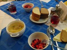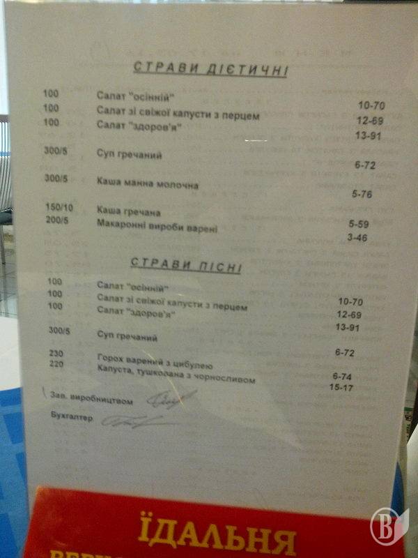 В том, что цены в последней и в самом деле соотносятся со средними по Чернигову, убедились и медийщики. Например, порция супа гречневого стоит 6,72 гривны, макарон – 3,46, салата «осеннего» – 10,70, борща с говядиной – 16,56. Качество блюд достаточно высоко, хотя по вкусу разные, ведь столовая – не ресторан для гурманов. Однако есть и фирменные рецепты, в частности фантастической можно назвать котлету по-киевски из куриного филе (!).