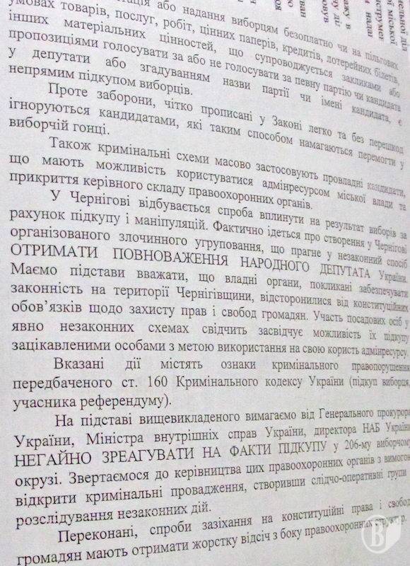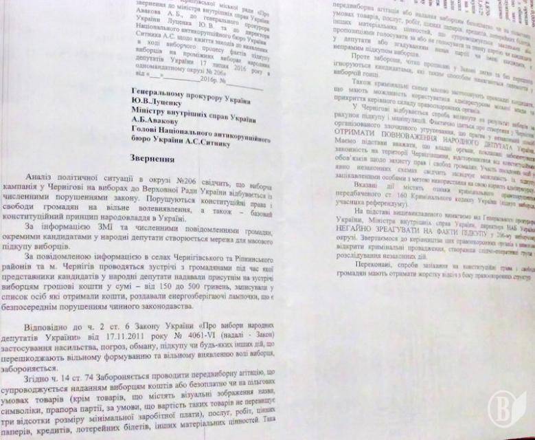 Речь идет о двух аналогичных обращениях к центральным правоохранительным органам относительно фактов подкупа избирателей в 206 округе, которые хотели принять во время заседания 9 сессии горсовета фракции «Батькивщина» и «Наш край».