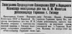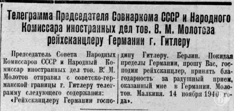 А наступного дня побачила світ телеграма В. Молотова. Подаємо мовою оригіналу: «Рейхсканцлеру Германии господину Гитлеру. Берлин. Покидая пределы Германии, прошу Вас, господин рейсхканцлер, принять благодарность за радушный прием, оказанный мне в Германии».