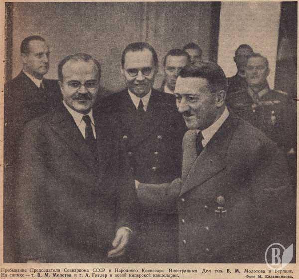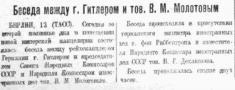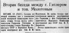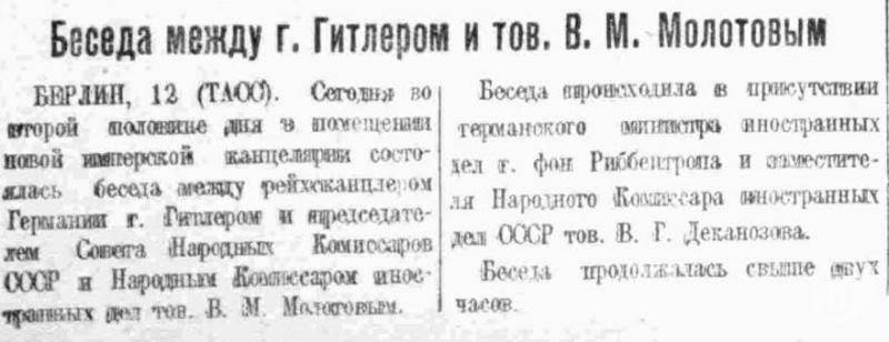 Після обміну привітаннями … тов. Молотов і г-н фон Ріббентроп пройшли вздовж фронту вишикуваної біля вокзалу роти почесної варти… Вся німецька центральна й провінційна преса одностайно оцінює прибуття тов. Молотова в Берлін, як факт першорядної політичної важливості».