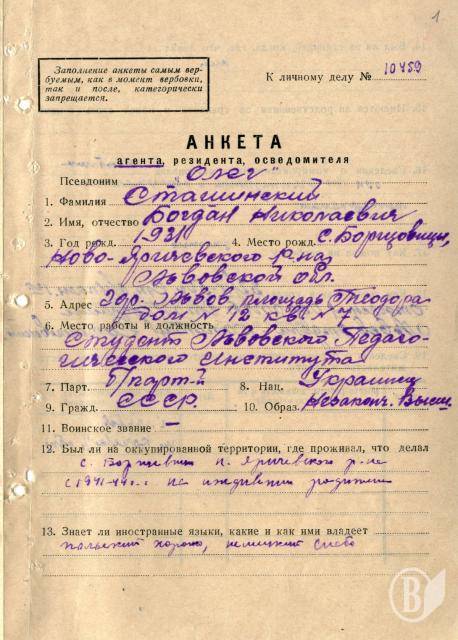 - - Анкета, автобіографія та характеристика агента МДБ «Олега» (Б. Сташинського);