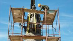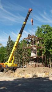 Людина без засобів індивідуального захисту голіруч лізе вигрибати камінчики з-під багатотонного підвішеного пам'ятника.