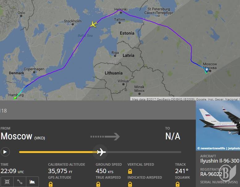 Хоча навпрошки з Москви до Гамбургу – на захід, через Білорусь,Литву і, можливо, Польщу. Однак літак Путіна оминув і Білорусь, і три прибалтійські країни.