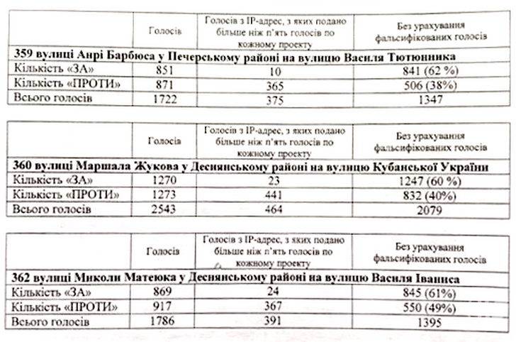 Відкинувши «ватяні» голоси, які йшли з однієї ІР-адреси, Комісія встановила, що за вулиці Кубанської України, Василя Іваниса, генерала Армії УНР Василя Тютюнника і ще низки вулиць було віддано більше голосів «за», аніж «проти».