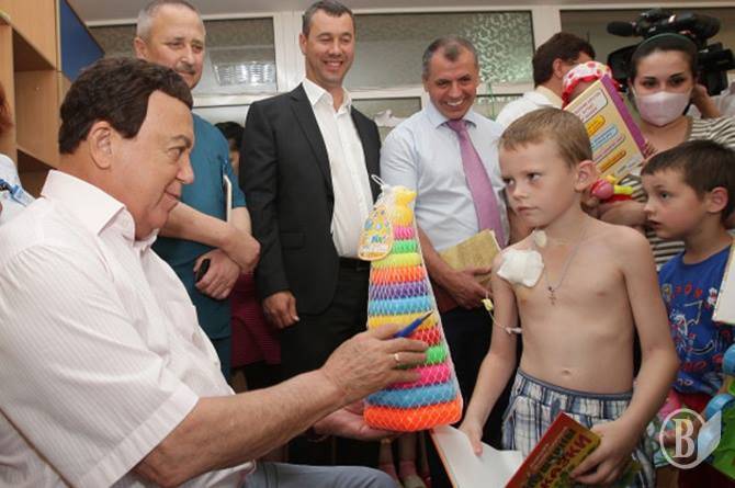 Відвідував Кобзон і окупований Крим. В Україні стало «мемом» фото, на якому Кобзон дарує 8-літньому хворому на рак хлопчику яскраву різнобарвну пірамідку (трішки не вдповідну і віку дитині, і ситуації).