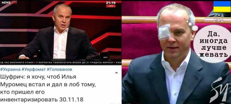 Так, пан Шуфрич, будучи нібито народним депутатом України і представляючи, за визначенням, український народ, виступив в залі Ради за український підрозділ церковного управління ФСБ РФ та на додачу чимось йому завоним постер про буцімто кума ворожого російського фюрера.