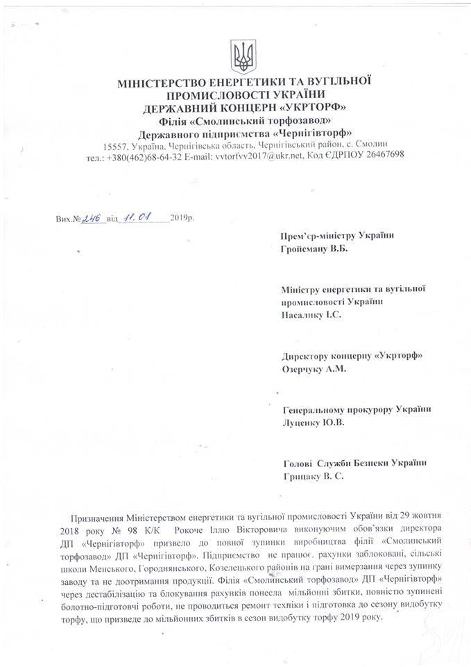 Філія «Смолинський торфозавод» ДП «Чернігівторф» через дестабілізацію роботи підприємства та зумисне заблоковані рахунки незаконно призначеним ставлеником Міненерговугілля Іллею Рокоче понесла мільйонні збитки.