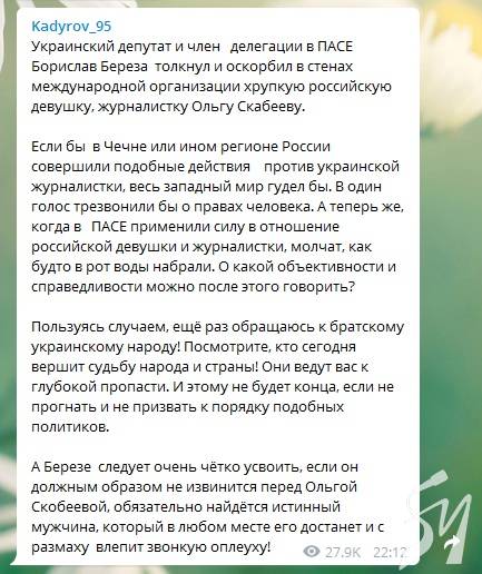 «Березе следует очень чётко усвоить, если он должным образом не извинится перед Ольгой Скобеевой, обязательно найдётся истинный мужчина, который в любом месте его достанет и с размаху влепит звонкую оплеуху!» – закінчується звернення нібито від Рамзана Ахматича в Telegram.