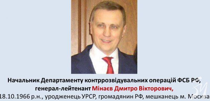 «Але справжнім організатором вбивств, у наслідок яких загинули Олександр Хараберюш і Максим Шаповал, та мав бути ліквідований ще один офіцер українських спецслужб, є генерал-лейтенант ФСБ РФ Мінаєв Дмитро Вікторович, начальник Департаменту контррозвідувальних операцій Федеральної служби безпеки РФ», - наголосив Голова СБУ.