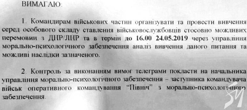 «Командирам військових частин організувати та провести вивчення серед особового складу ставлення військовослужбовців стосовно можливих перемовин з “ДНР”/”ЛНР” та в термін до 16:00 24.05.2019 через управління морально-психологічного забезпечення аналіз вивчення даного питання та можливі наслідки зазначеного», – йдеться у документі.