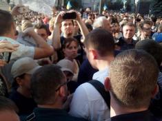 Під центральним входом до АП відбулась штовханина. Учасники акції хотіли повісили табличку "Адміністрація губернатора Малоросії", однак поліція її вирвала і порвала.