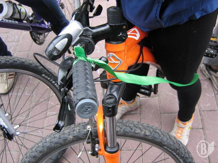 Люди продолжали «стягиваться». Оргкомитет начал раздавать зелёные ленты (символы Черниговского велодня), яркие жилеты (которые любезно предоставил один из участников) и символические знаки (белые флажки с зелёной эмблемой – человек, держащий велосипед над головой), которые также изготовили самостоятельно.