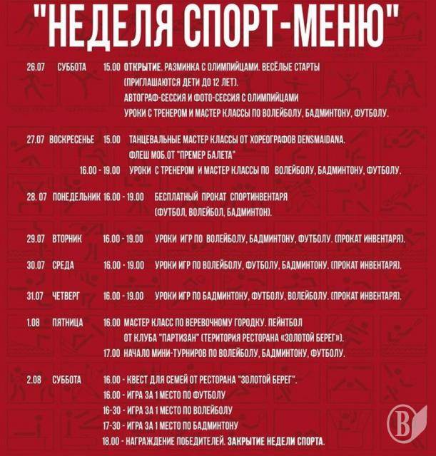 Основною родзинкою «Тижня спорт-меню» стане його відкриття. У якому візьмуть участь чернігівські олімпійці. На глядачів також очікує автограф та фото сесіїї з олімпійцями.