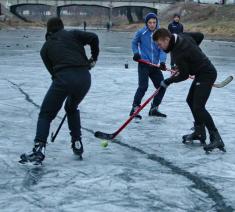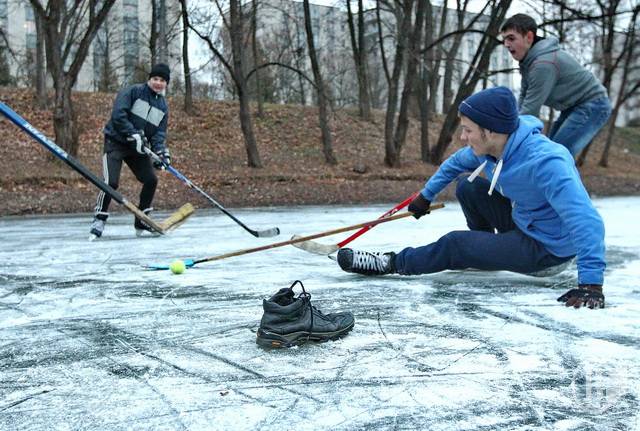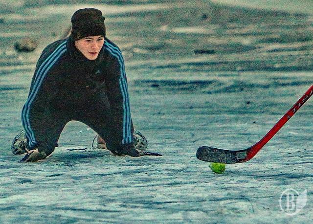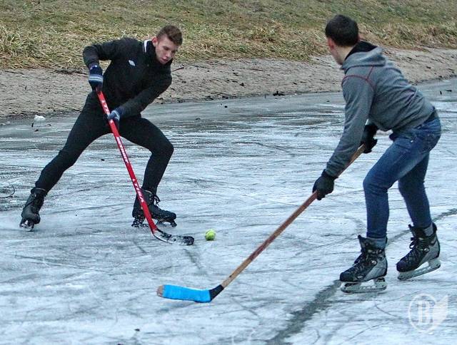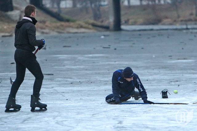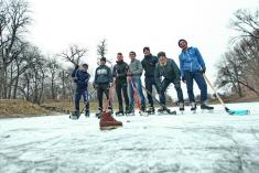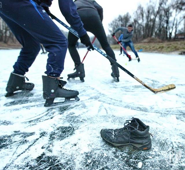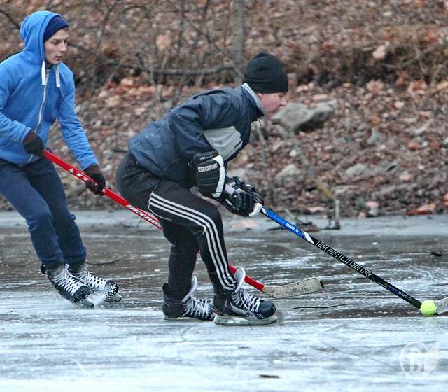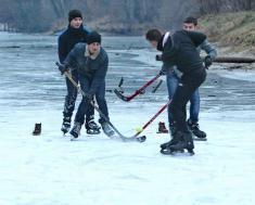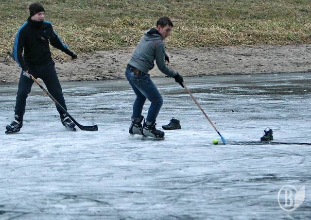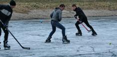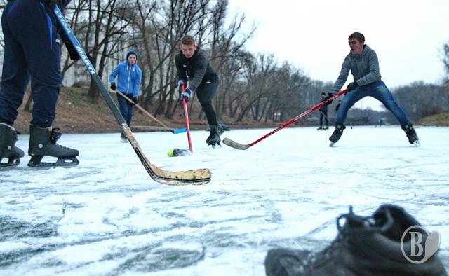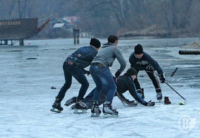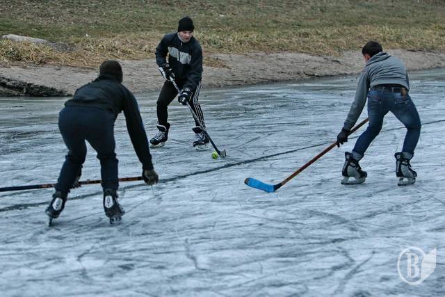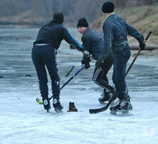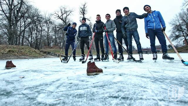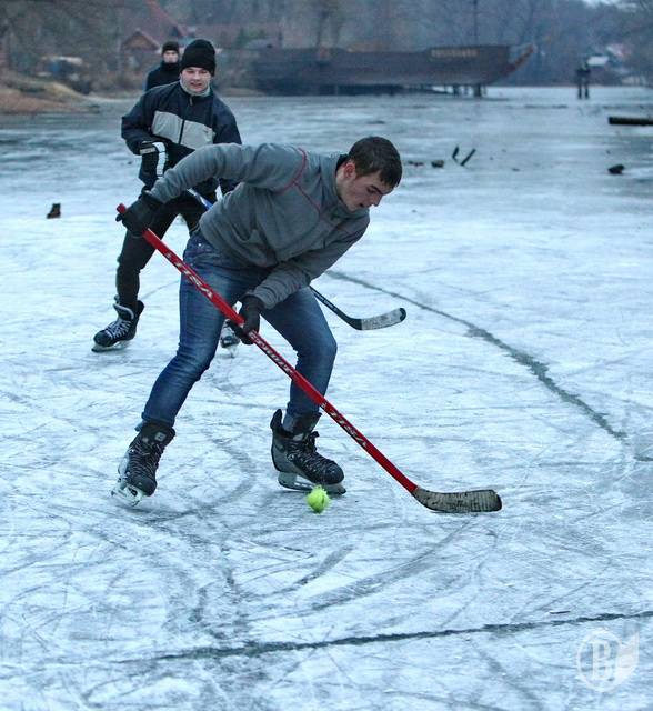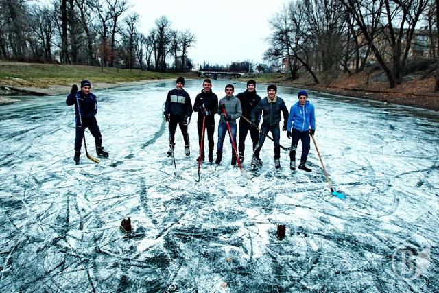 Хутенько дістаю фотокамеру і мерщій до них. А лід десь вже сантиметрів 5-7. Гладенький такий. Хлопці зібрались, хто звідки. Головне, що вони вже давненько мріяли зіграти в хокей.