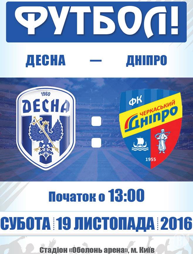 Матч між командами футбольних клубів «Десна» і «Черкаський Дніпро» відбудеться в цю суботу в Києві на стадіоні «Оболонь-арена». Початок матчу – 19 листопада о 13:00.