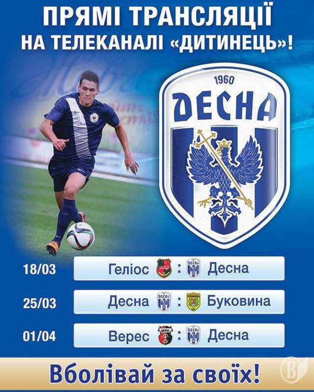 Чернігівський футбольний клуб «Десна» обіцяє на каналі «Дитинець» (чи то пак вони разом обіцяють?) прямі трансляції матчів «Десни» 18 і 25 березня та 1 квітня.