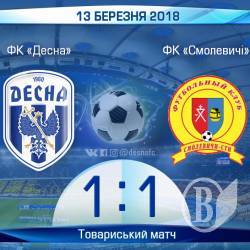 Команда чернігівського футбольного клубу «Десна» в рамках тренувального збору в Туреччині зіграла з нічийним рахунком 1:1 у товариському матчі з ФК «Смолевичі» (Білорусь).