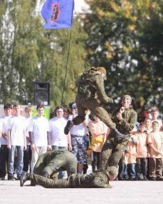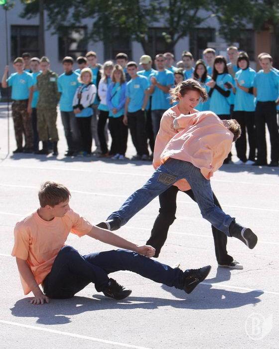 діти голими руками, ліктями і незахищеними головами лазять по затоптаному, запльованому, порепаному асфальту! Хоч би ці організатори-солдафони брезент постелили, якщо іншого немає. Була очевидцем цього дитячого шоу для унтер-пришибеєвих. Жахливе враження: діти перекидали одне одного через себе, головою до асфальту залишалося іноді 5 сантиметрів. А дорослі дебіли споглядали з трибун. Про права дитини вони, звісно, нічого не чули, а раптом би хтось поранився! Звісно, долоні й лікті вони поздирали...