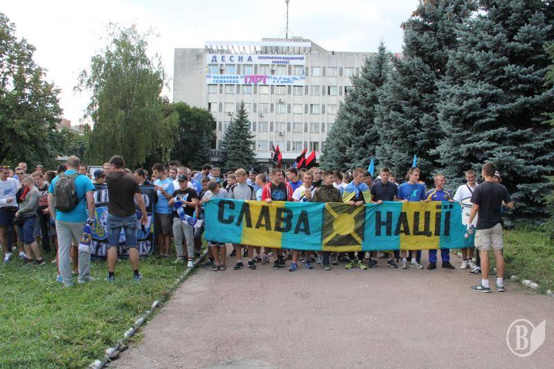 Саме тому в знак підтримки тих патріотів, які сьогодні зі зброєю в руках відстоюють незалежність суверенітет і територіальну цілісність нашої держави на Донбасі вболівальники обох команд перед початком матчу разом з громадськими діячами та жителями Чернігова влаштували патріотичну ходу вулицями Чернігова під час якої розгорнули плакати патріотичного змісту, а також вигукували патріотичні гасла.