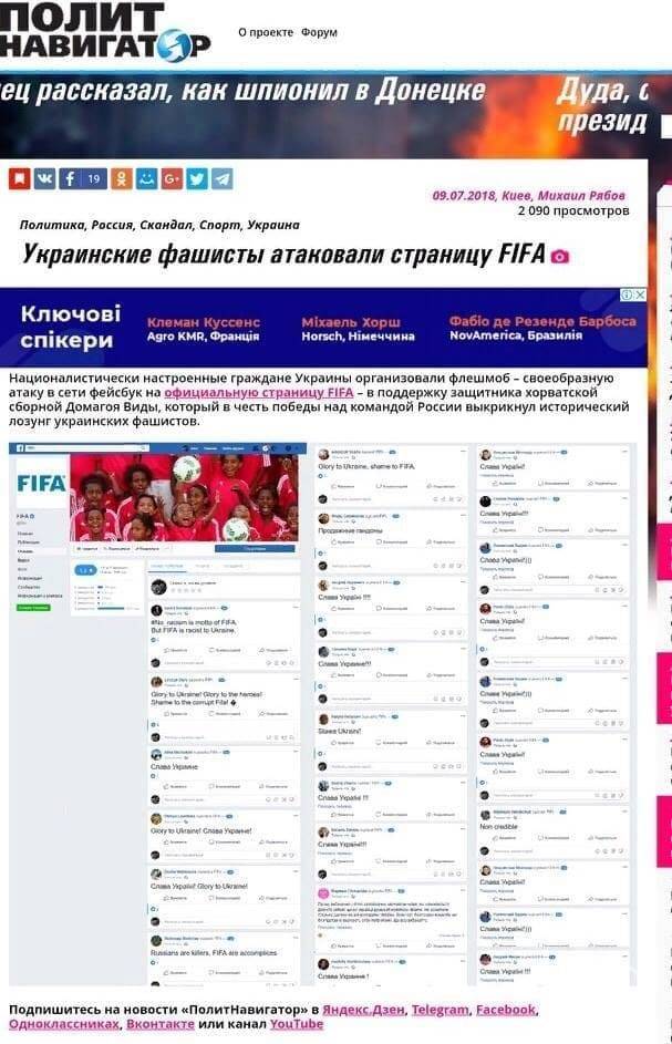 Це така реакція у відповідь на «флеш-моб» українців на Facebook- сторінці FIFA через відсторонення і штраф хорватського футболіста – учасника переможного матчу Чемпіонату світу з футболу 2018-го, в якому хорватська збірна витурила з чемпіонату збірну РФ.